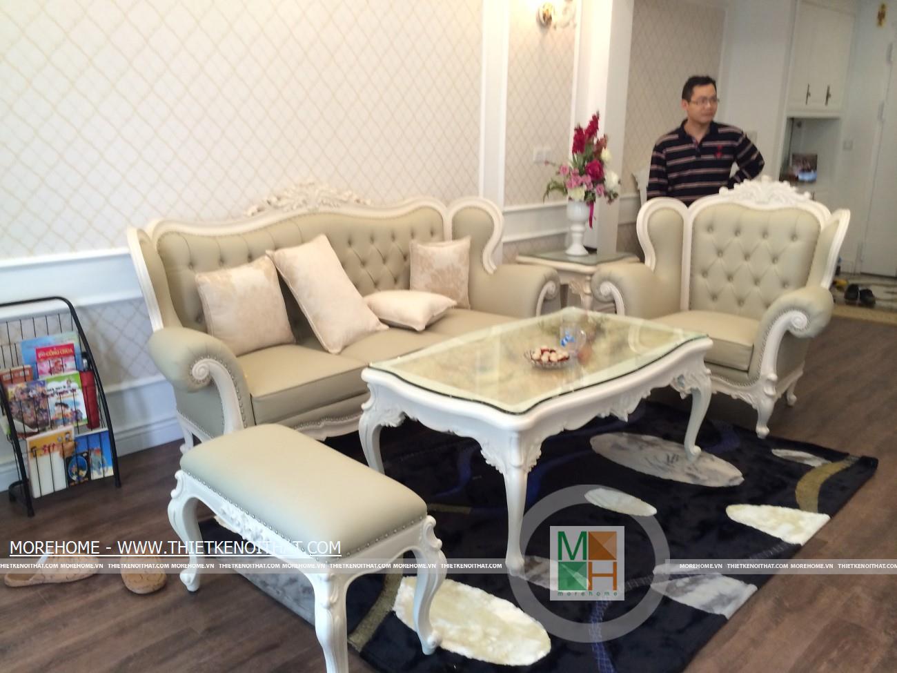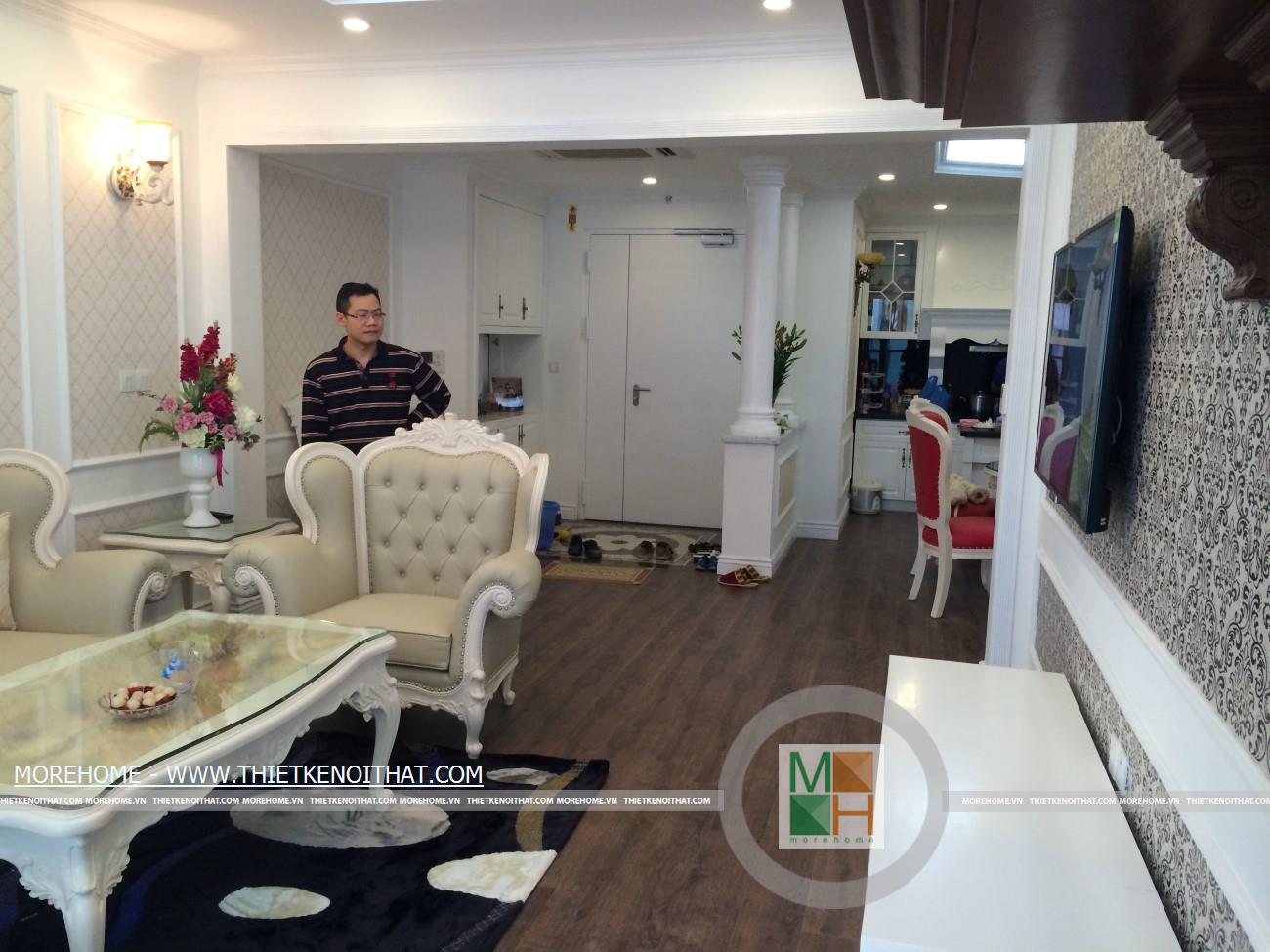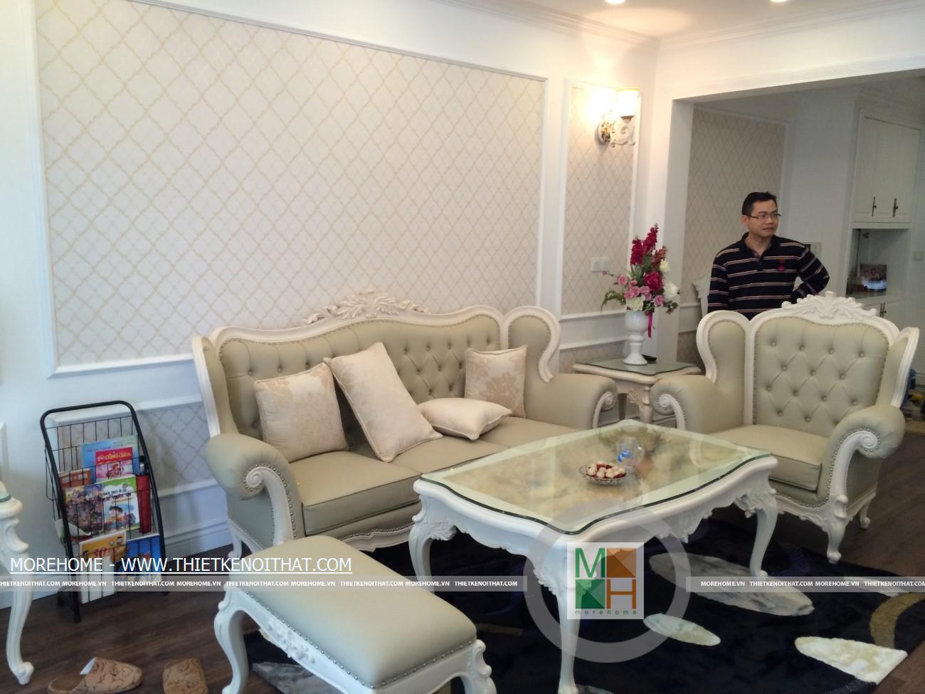 Thiết kế và thi công nội thất chung cư Mandarin Garden là một trong những thiết kế nổi bật thể hiện rõ vẻ đẹp của tân cổ điển. Thiết kế nội thất phòng khách sử dụng tone màu sáng, kem sữa với các chi tiết nổi bật điển hình của tân cổ điển mang đến cho không gian sống một vẻ đẹp thu hút và vô cùng ấn tượng, gợi mở một không gian sống quý phái, sang trọng mang hơi hướng châu Âu cổ điển. Thiết kế ghế sofa to, rộng với các chi tiết trang trí mềm mại và tinh tế góp phần lớn thể hiện phong cách tân cổ điển mà kiến trúc sư muốn thể hiện, tạo sự đồng nhất cho thiết kế.