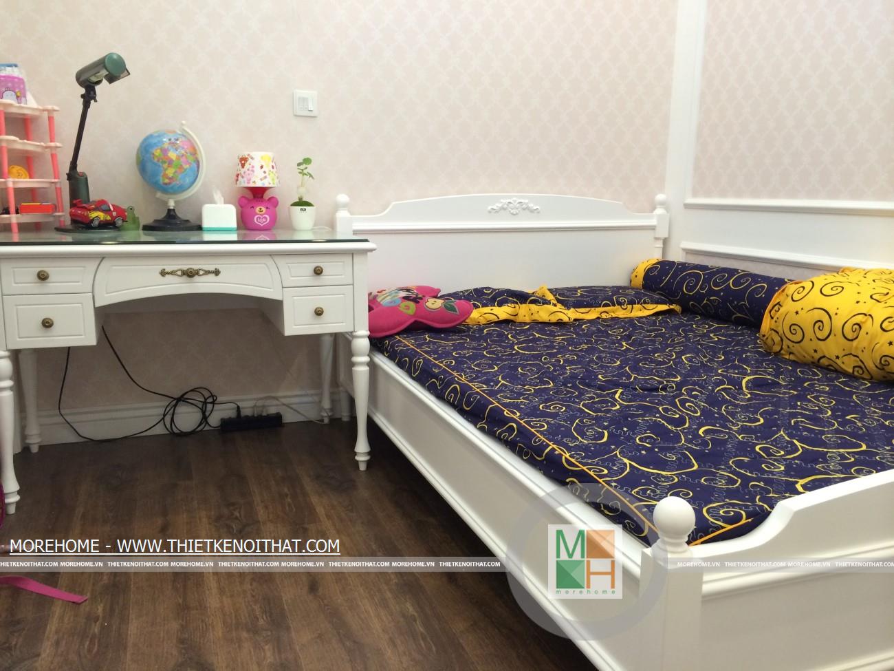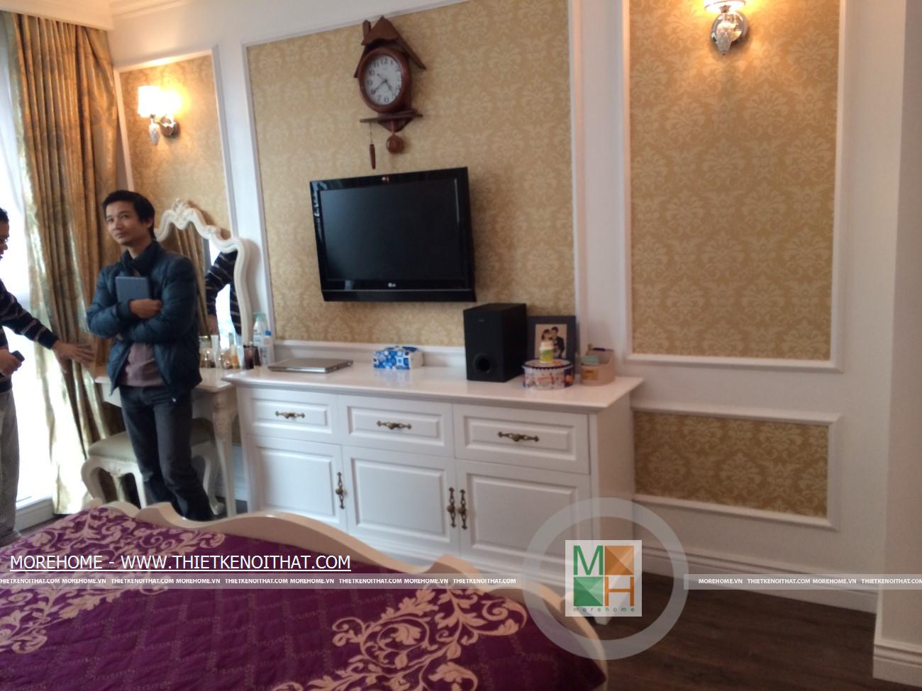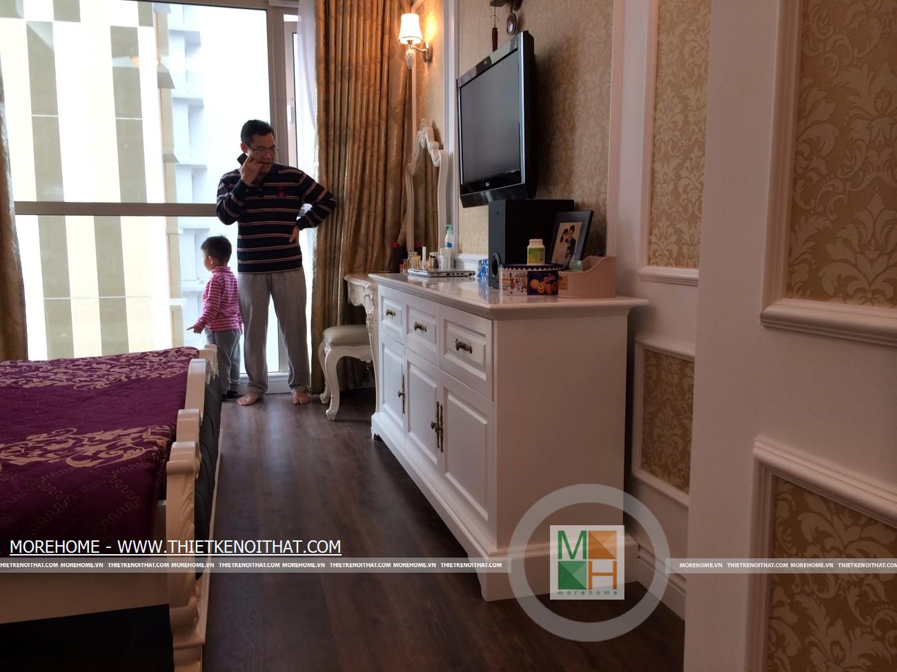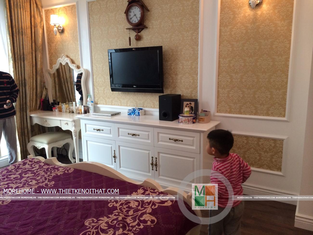 Bên cạnh đó, các thiết kế trang trí nội thất như giường, tủ được trau chuốt kỹ ở các hoa văn tinh tế giúp mang đến cho không gian cảm giác mềm mại và cuốn hút hơn. Bên cạnh đó, đây cũng là đặc điểm nổi bật giúp tạo sự đồng nhất cho thiết kế và thi công nội thất chung cư, góp phần lớn định hình phong cách thiết kế tân cổ điển.