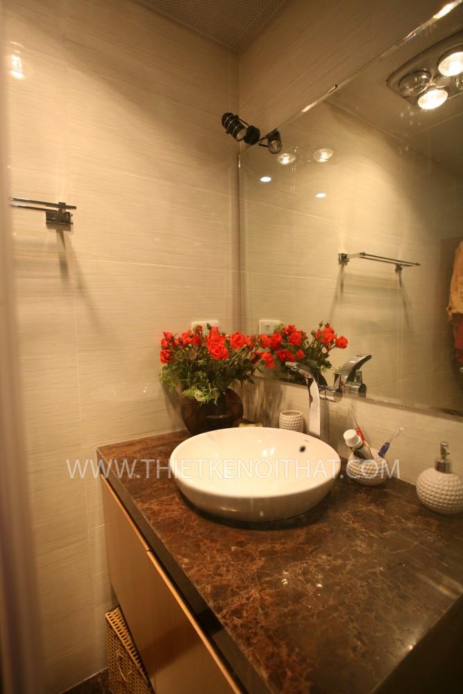Cuối cùng là thiết kế và thi công nội thất phòng tắm kết hợp nhà vệ sinh mang phong cách hiện đại. Không gian thiết kế khá nhỏ, không có nhiều khoảng trống khiến cho thiết kế còn hạn chế, độ thoáng và mở khá thấp. Tuy nhiên, nhận biết được mặt hạn chế này và vận dụng khéo léo các cách khắc phục, kiến trúc sư đã thành công trong việc mang lại cảm giác cơi nới cho không gian hẹp. Nhờ vào việc sử dụng các vật liệu nhẹ như gương, kính cường lực trong suốt, đá tự nhiên,… có độ phản chiếu cao mà thiết kế tạo độ bóng thích hợp, tương tác ánh sáng phù hợp góp phần tăng độ mở và thoáng cho không gian hẹp.