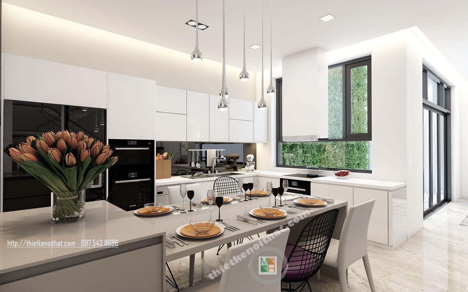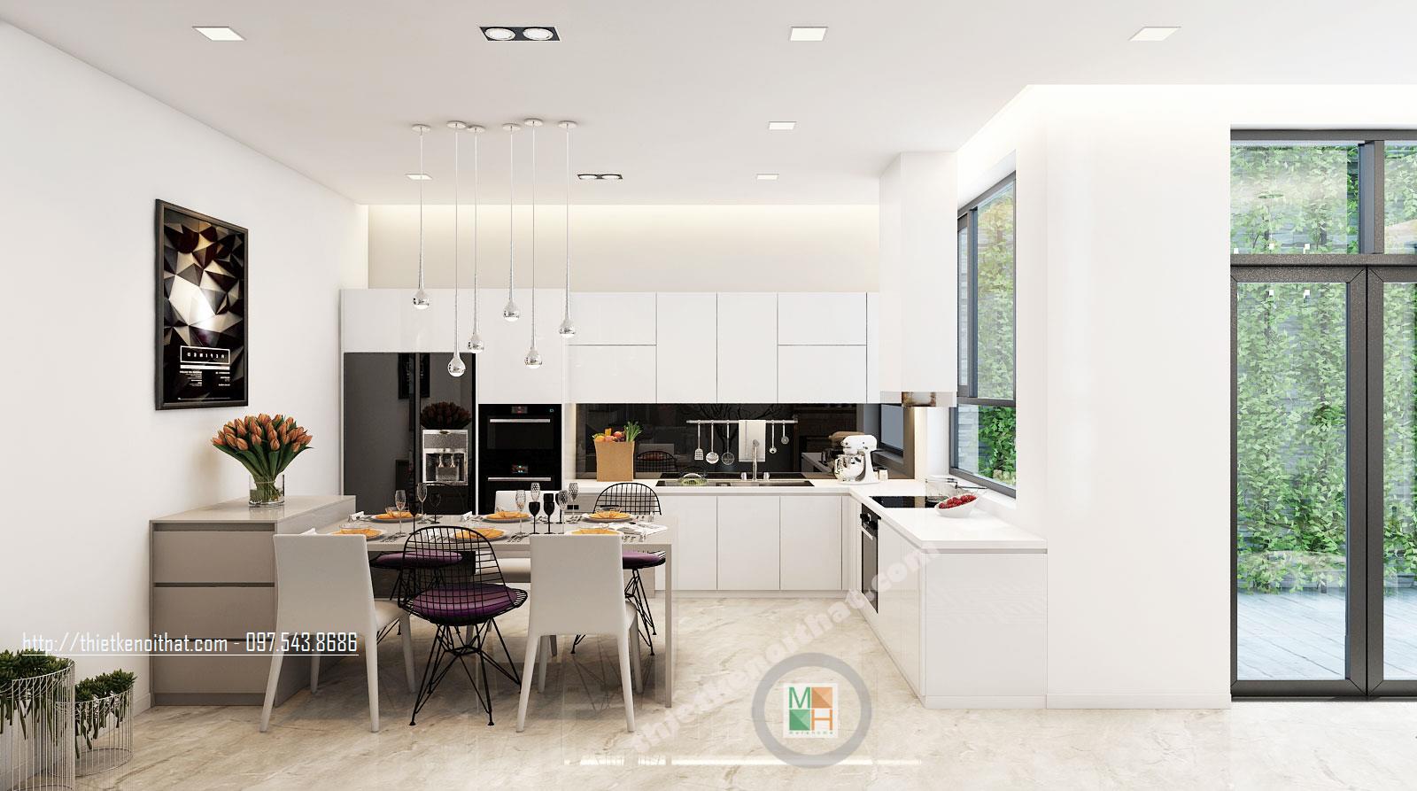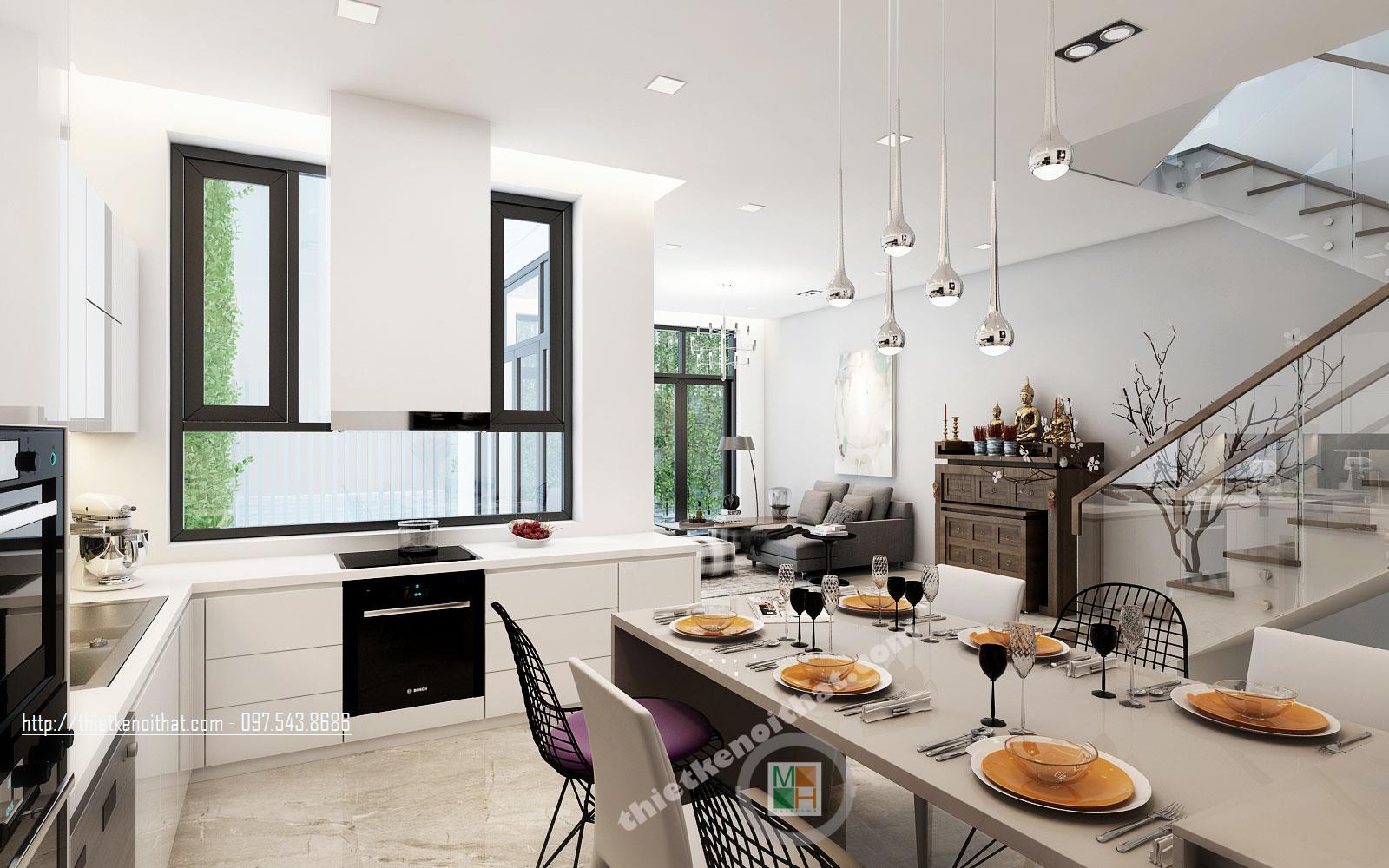 Thiết kế không gian bếp và bàn ăn liền kề thể hiện ngôn ngữ thiết kế hiện đại đồng nhất. Tông màu chủ đạo được sử dụng là tông màu xám và ghi sáng mang đến cảm giác nhẹ nhàng và hiện đại cho căn nhà. Hệ thống tủ bếp mở rộng đón ánh sáng tự nhiên mang đến cảm giác thoải mái và thư giãn cho căn phòng. Tủ bếp thiết kế đơn giản hướng sáng, tránh cảm giác bí bách và tối tăm. Bàn ăn thiết kế cách tân sáng tạo là điểm nhấn nổi trội và tạo ấn tượng cho căn phòng.