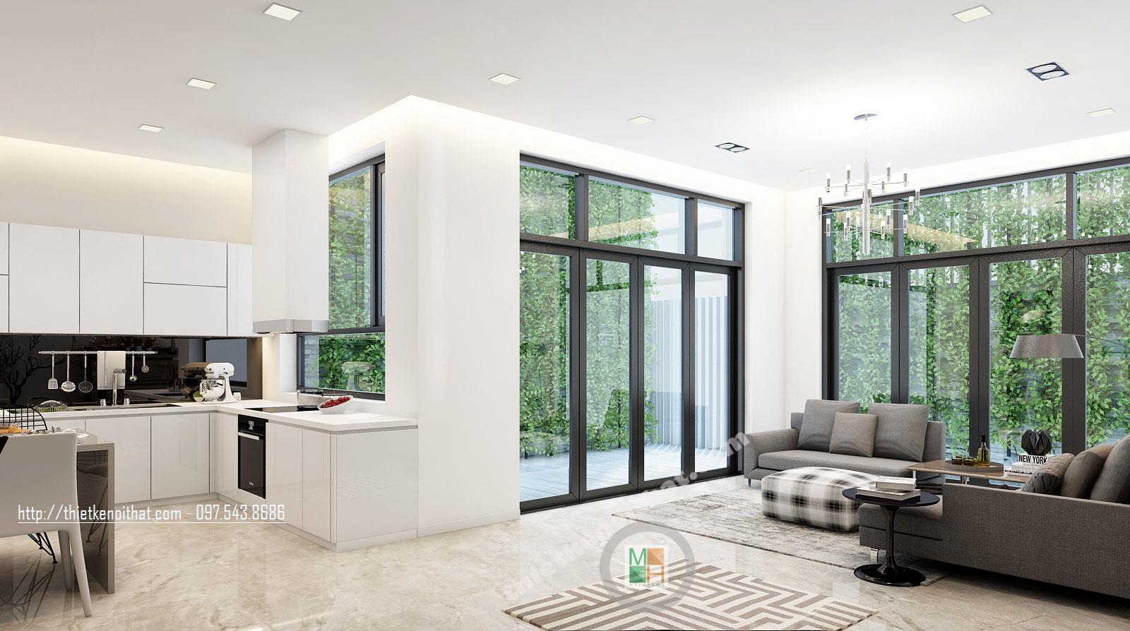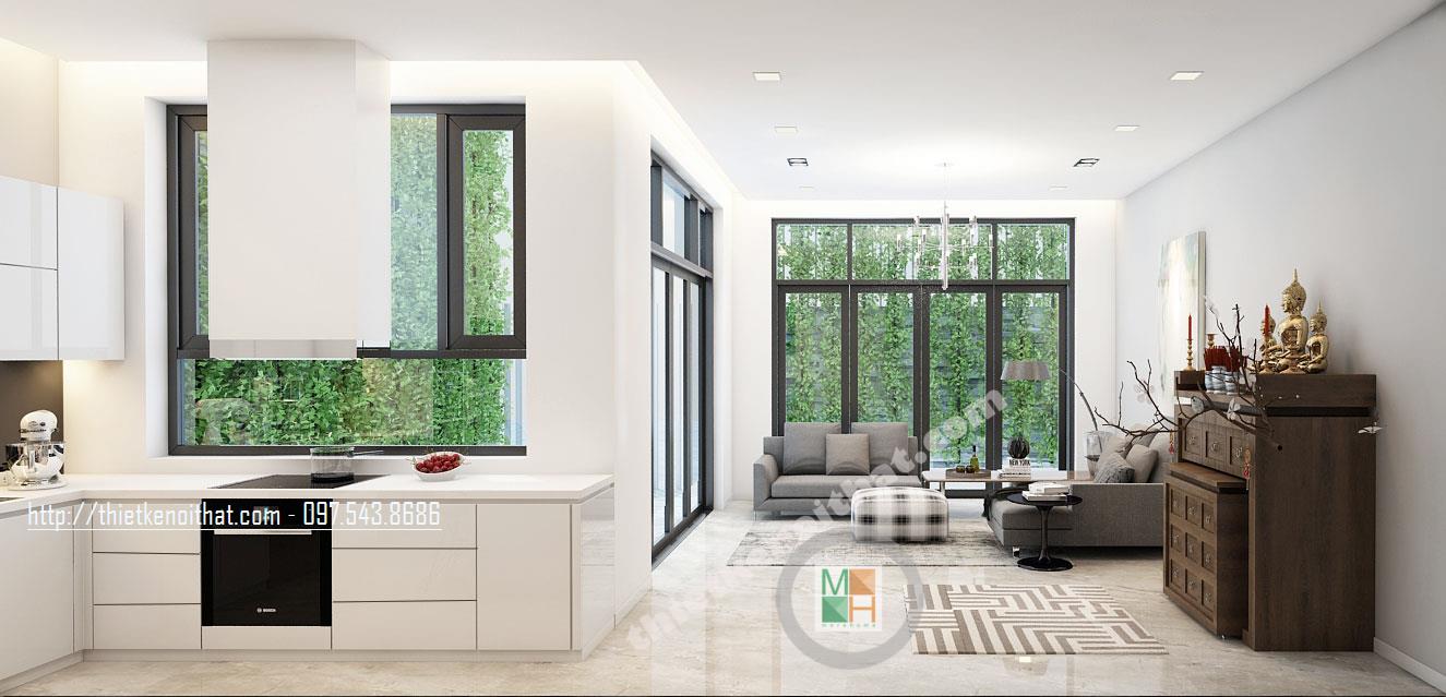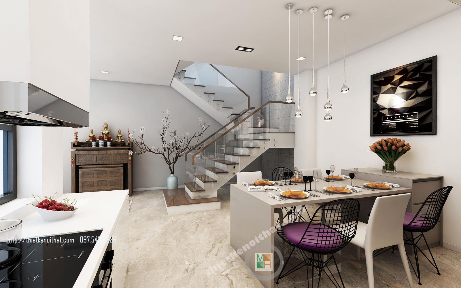 Thiết kế không gian bếp và bàn ăn liền kề thể hiện ngôn ngữ thiết kế hiện đại đồng nhất. Tông màu chủ đạo được sử dụng là tông màu xám và ghi sáng mang đến cảm giác nhẹ nhàng và hiện đại cho căn nhà. Hệ thống tủ bếp mở rộng đón ánh sáng tự nhiên mang đến cảm giác thoải mái và thư giãn cho căn phòng. Tủ bếp thiết kế đơn giản hướng sáng, tránh cảm giác bí bách và tối tăm. Bàn ăn thiết kế cách tân sáng tạo là điểm nhấn nổi trội và tạo ấn tượng cho căn phòng.