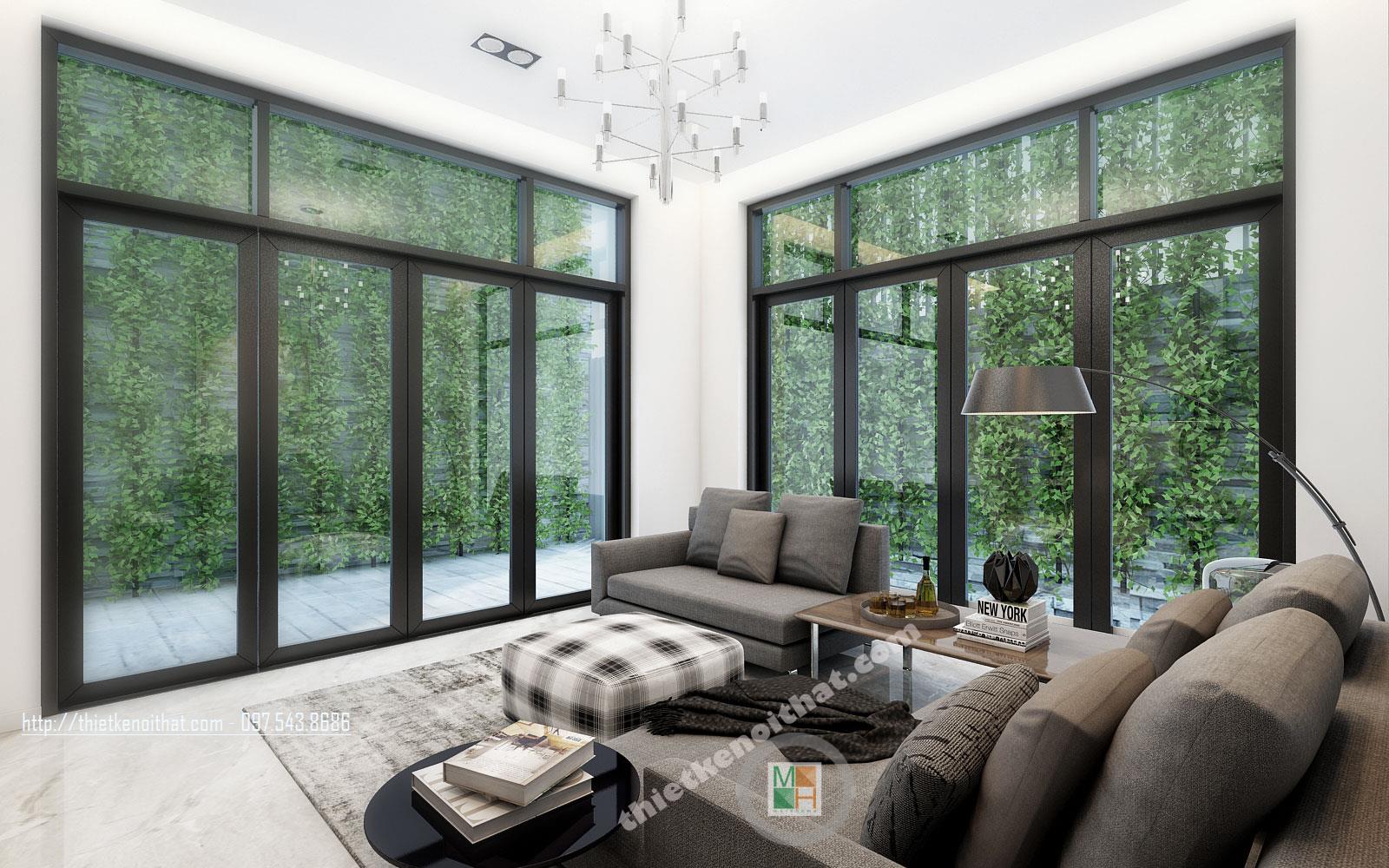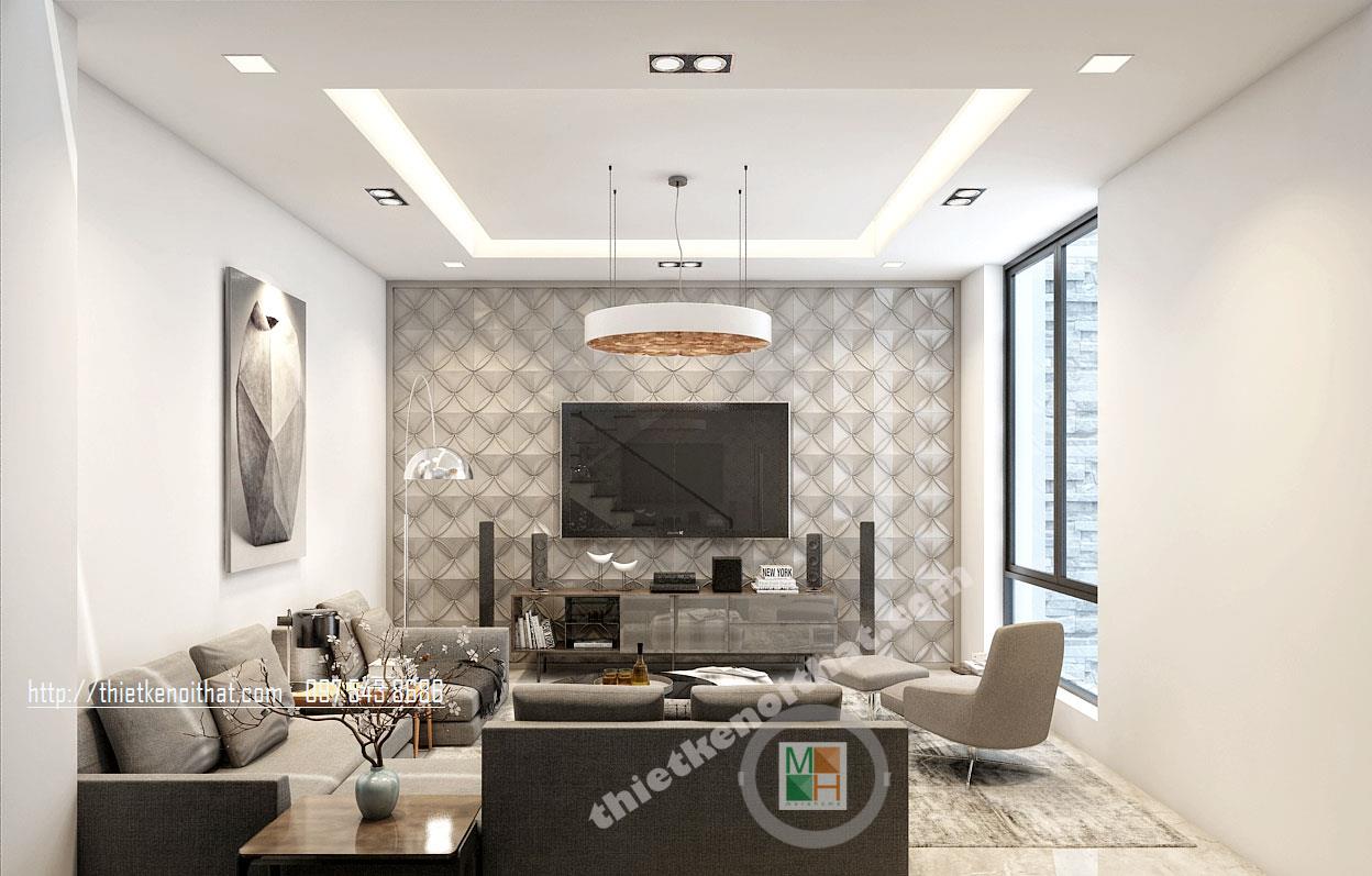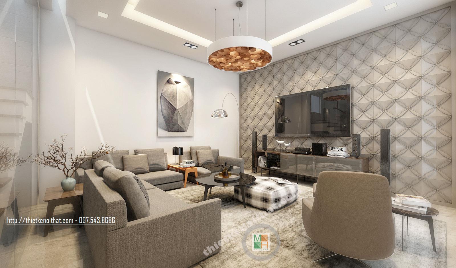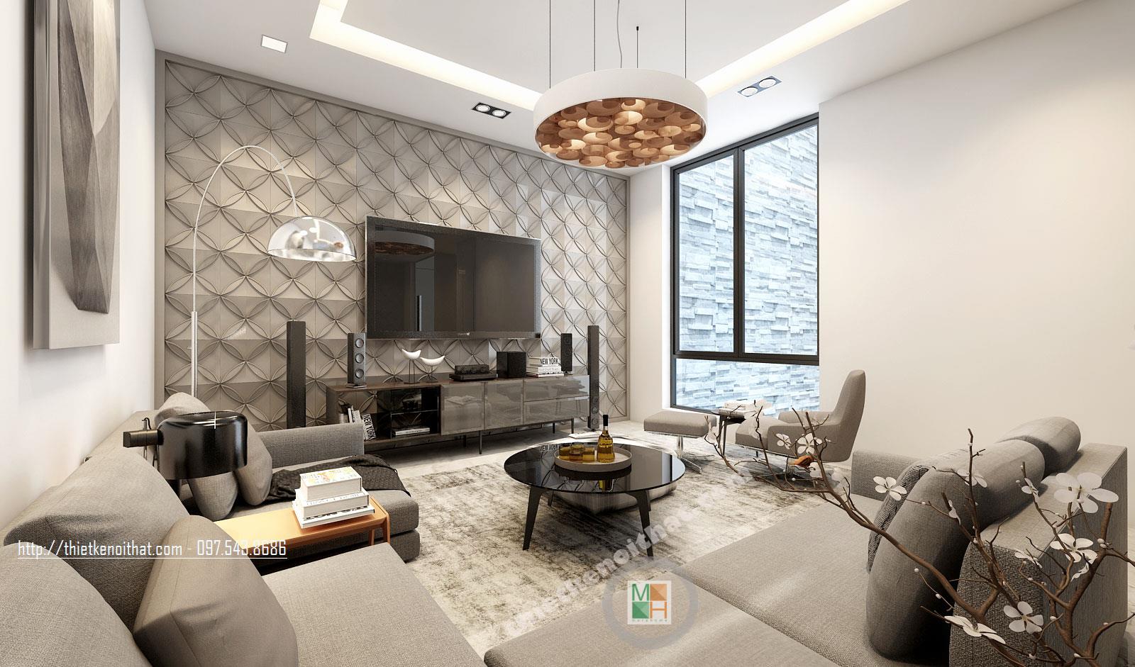 Thiết kế nội thất phòng khách sử dụng tông màu lạnh là ghi sáng và trắng làm chủ đạo mang đến vẻ hiện đại và sang trọng. Thay vì sử dụng tông màu đơn sắc, kiến trúc sư sử dụng giấy dán tường 3D độc đáo làm nổi bật và tạo điểm nhấn không gian cho căn phòng. Thiết kế phòng vuông, không quá cầu kỳ về nội thất như tủ kệ nhưng vẫn đủ toát lên một vẻ tiện nghi và vô cùng thoải mái. Một điểm hạn chế của không gian này là diện tích đa năng còn nhỏ, khá bất tiện cho trẻ nhỏ, không gian sinh hoạt chung đều không quá lớn mà chủ yếu là đặt ghế sofa. Thiết kế sử dụng màu lạnh vì thế khá nhàm chán, tuy nhiên việc sử dụng sắc vàng ấm từ ánh đèn hay trang trí ánh kinh tương phản cũng góp phần khắc phục nhược điểm này và tránh cảm giác đơn điệu cho gia chủ.