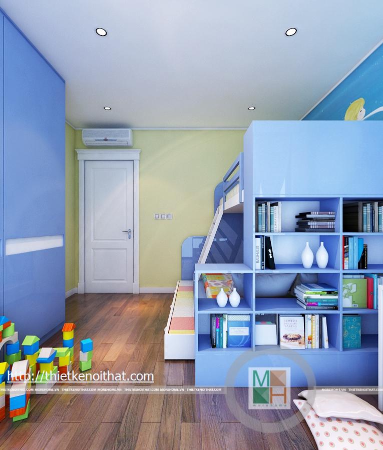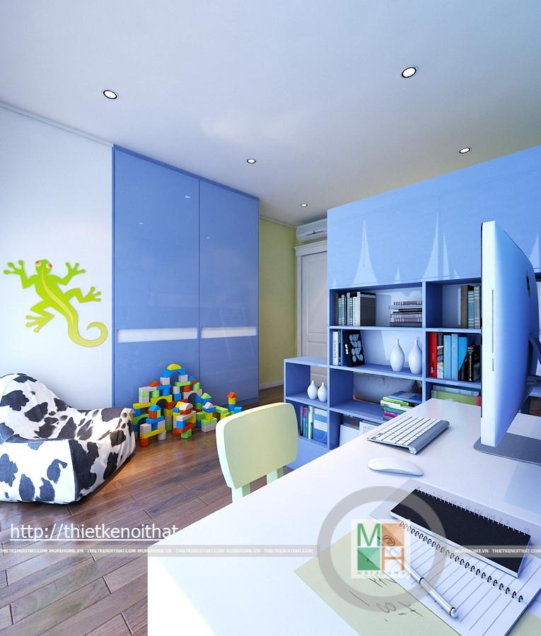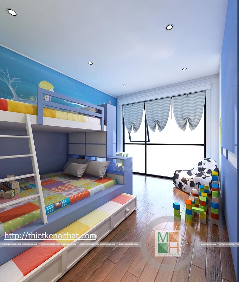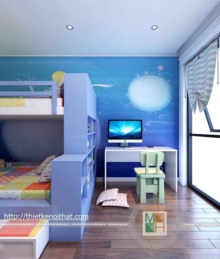 Phòng ngủ của con lấy gam màu xanh da trời làm chủ đạo kết hợp với những họa tiết ngộ nghĩnh trên tường, tạo sự sinh động và khỏe khoắn. Giường tầng được kết hợp làm tủ để đồ và kệ đồ nhằm tiết kiệm diện tích. Tủ quần áo trong phòng là tủ hai cánh sát trần và cùng màu xanh với màu giường. Bàn học được thiết kế nhỏ gọn kê cạnh cửa sổ nhằm tận dụng ánh sáng tự nhiên.