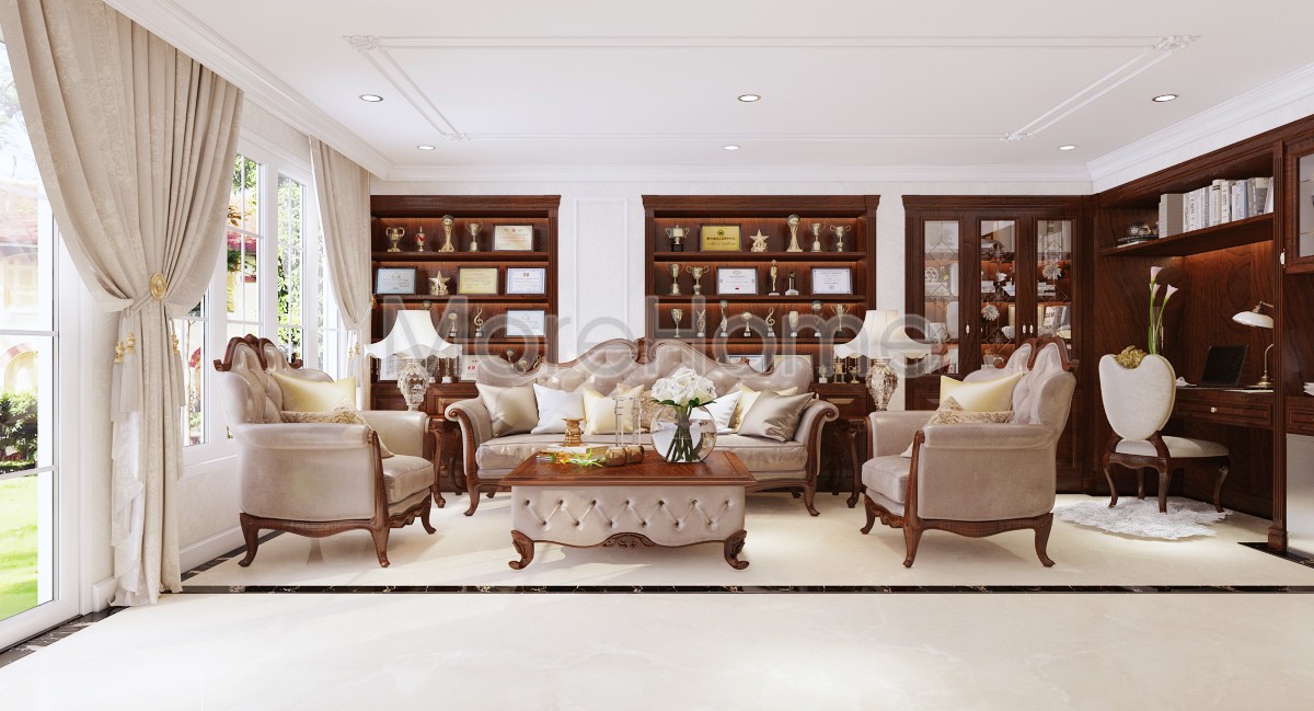Phòng khách tân cổ điển này được lựa chọn với gam màu nâu, và vải sofa nỉ màu trắng sữa. Được thiết kế với đường cong uyển chuyển của khung gỗ và sự êm ái của nệm sofa. Hệ thống kệ tủ trang trí cũng mang đến nét đẹp riêng cho căn phòng khách này.