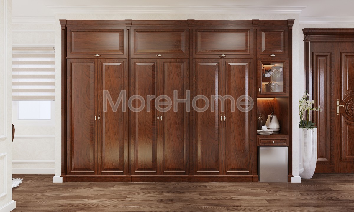 Thiết kế phòng bếp cổ điển với đảo bếp dài và chiếc ghế bar sang trọng. Bộ tủ bếp kín bằng gỗ được mang đến sự gọn dang, đa năng cho không gian bếp. Bên cạnh không gian nấu nướng gia chủ muốn đặt thêm kệ tủ rượu để tiện cho việc tiếp khách khi cần thiết. Hệ tủ bếp gỗ tựn nhiên màu nâu socola được sử dụng tạo sự thận thiện và ấm cúng cho căn phòng bếp.