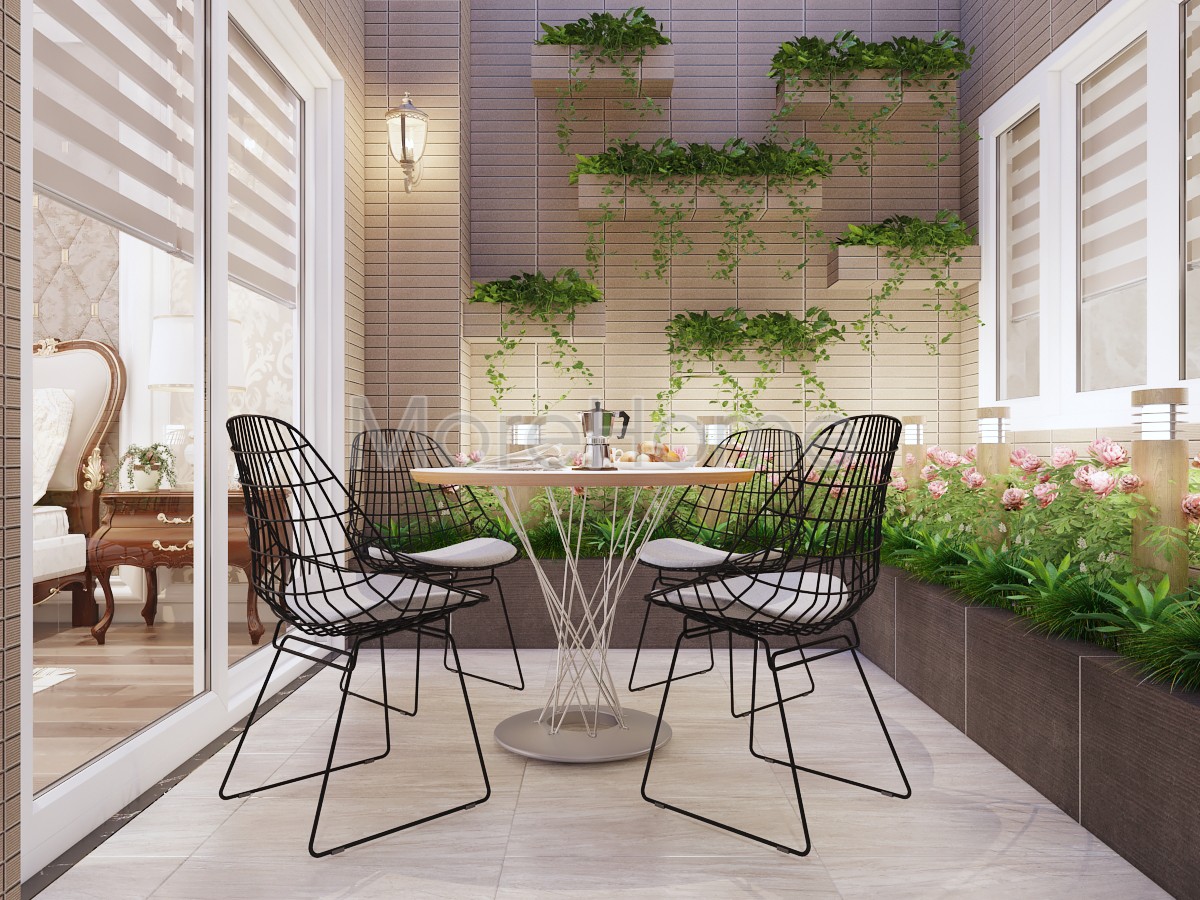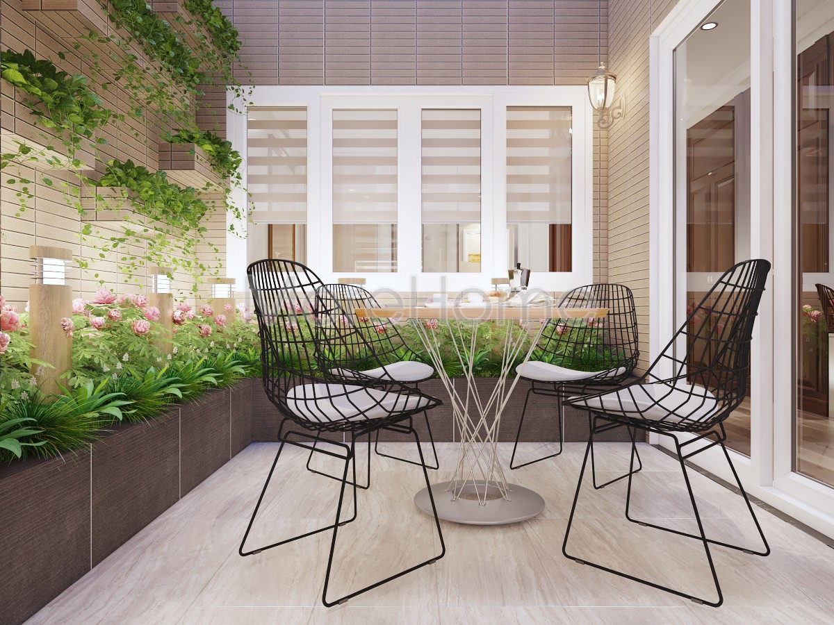 Bên ngoài phòng ngủ là hành lang được thiết kế thành một không gian thư giãn, giải trí vớ bộ bàn ghế eames và hệ thống bồn hoa nhỏ. Đây là một thiết kế thông minh cho gia chủ ngay trong căn biệt thự của mình.