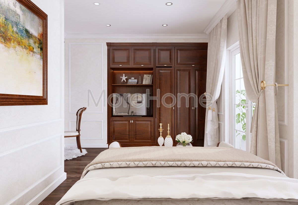 Phòng ngủ 2 được thiết kế nhẹ nhàng hơn cũng với hai gam màu trắng và nâu. Giấy dán tường được sử dụng ở mảng tường đầu giường làm điểm nhấn cho căn phong thể hiện được vẻ đẹp tân cổ điển. hệ thống tủ đồ , tủ tivi và tủ kệ trang trí được thiết kế liền với nhau tạo nên một không gian lưu trữ liền mạch cho căn phòng.