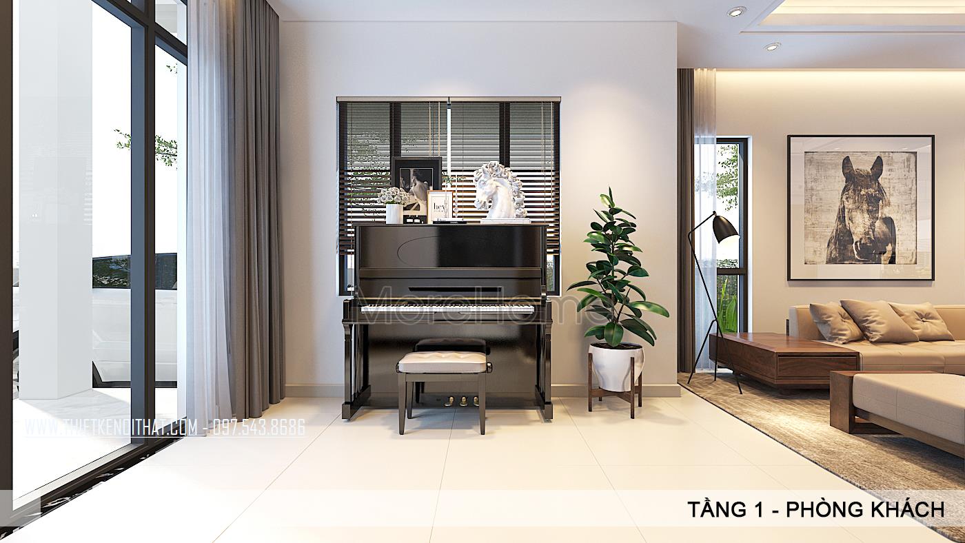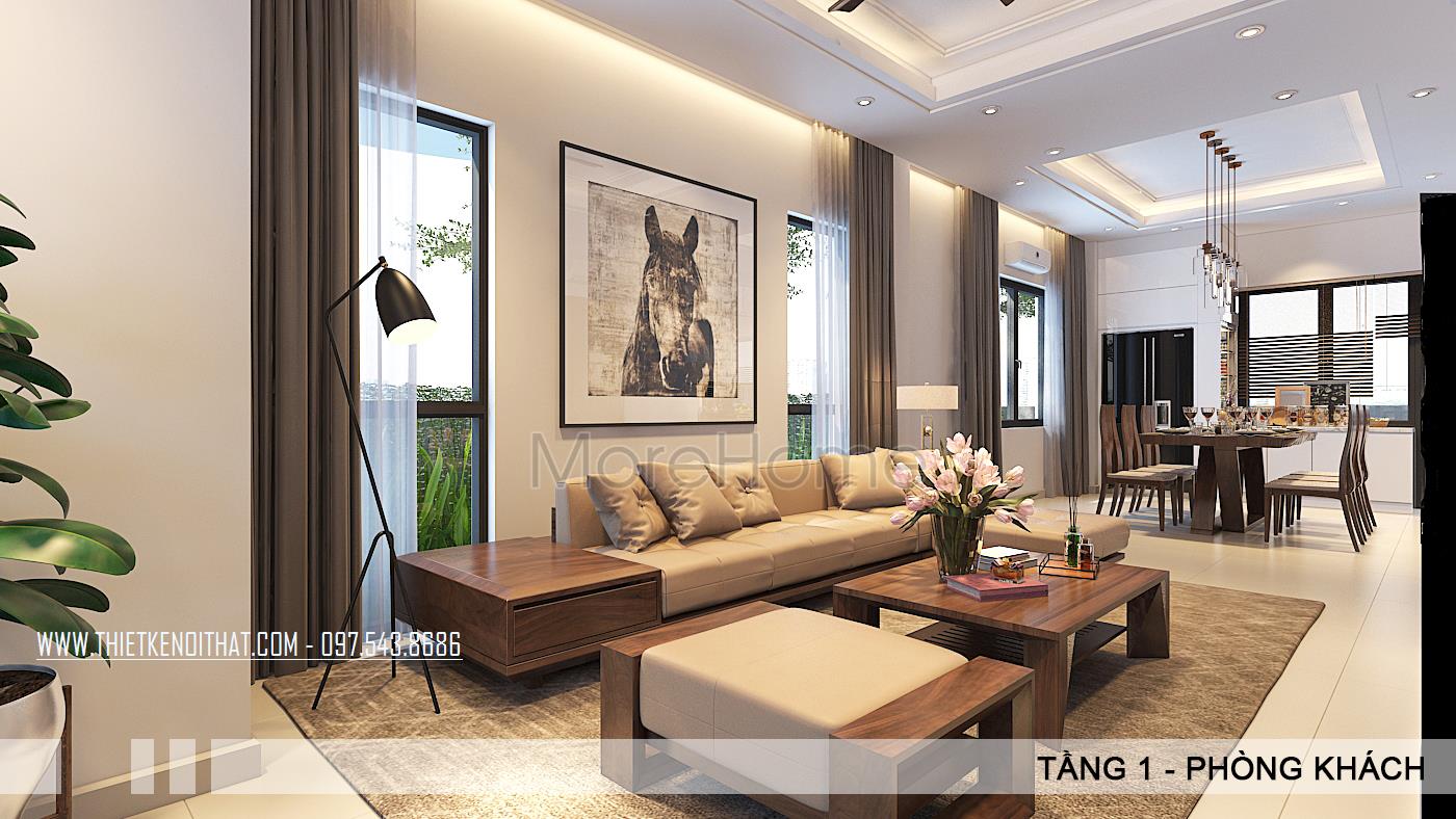 Nhìn vào không gian phòng khách này bạn có thể thấy được sự tối giản trong thiết kế của KTS Morehome. Phòng khách ngôi biệt thự có diện tích rộng, có độ thông thoáng cao nên các KTS đã lựa chọn một bộ sofa gỗ óc chso có kích thước lớn, được thiết kế tối giản các chi tiết rườm rà tạo nên vẻ đẹp hiện đại và vô cùng sang trọng.