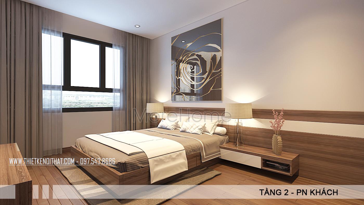 Phòng ngủ được thiết kế với mẫu giường gỗ óc chó cao cấp, thông minh giúp cho gia chủ có được giấc ngủ ngon. Nó còn mang lại vẻ đẹp tinh tế cho không gian phòng ngủ. Hệ tủ và kệ trang trí cũng được sử dụng chất liệu gỗ óc chó để tạo nên sự đồng nhất về màu sắc cho căn phòng.