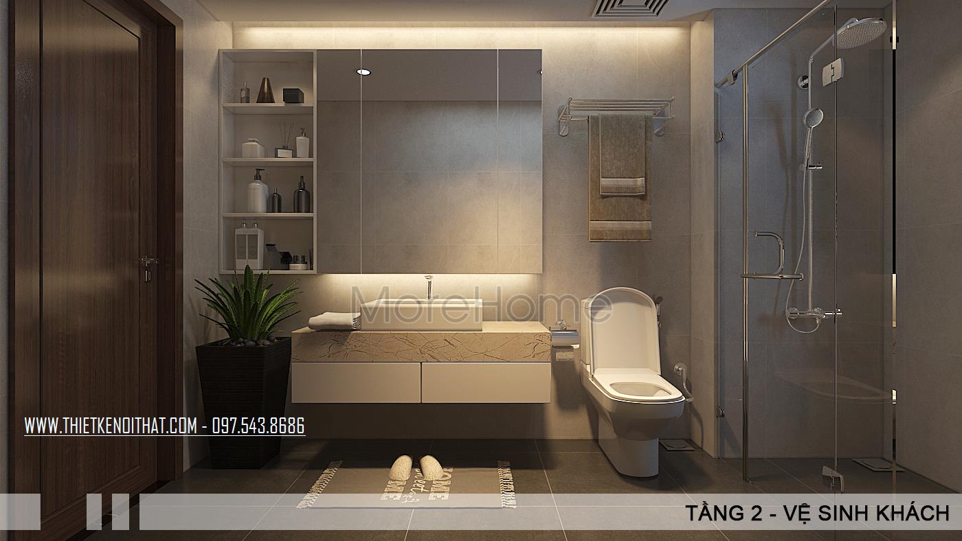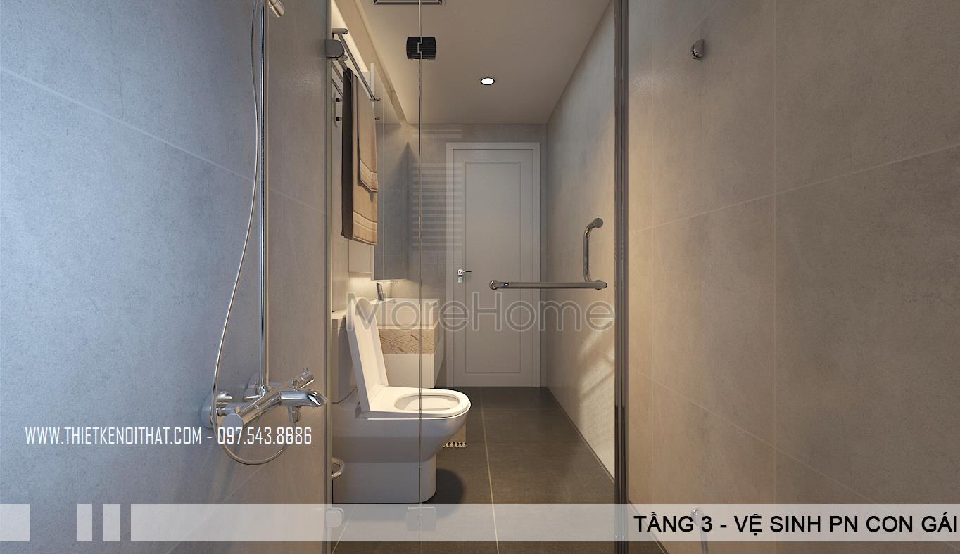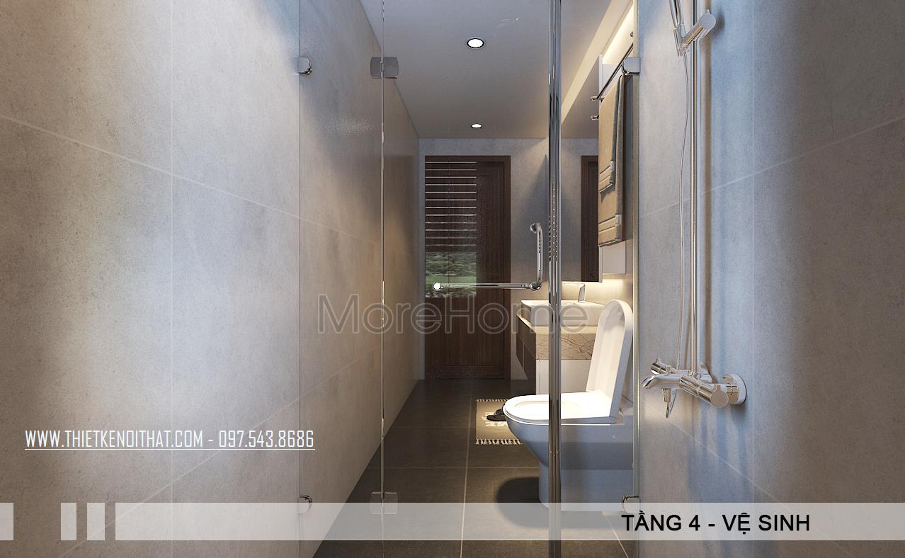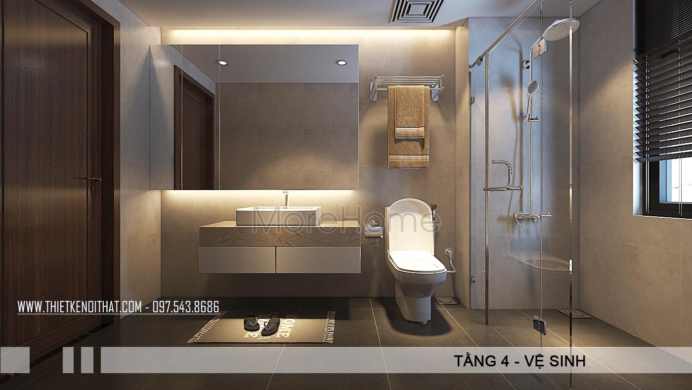 Thiết kế phòng tắm đơn giản, tinh tế và tiện nghi với vách kính phòng tắm và thiết bị vệ sinh hiện đại. Mang đến người dùng cảm giác thư thái nhất.