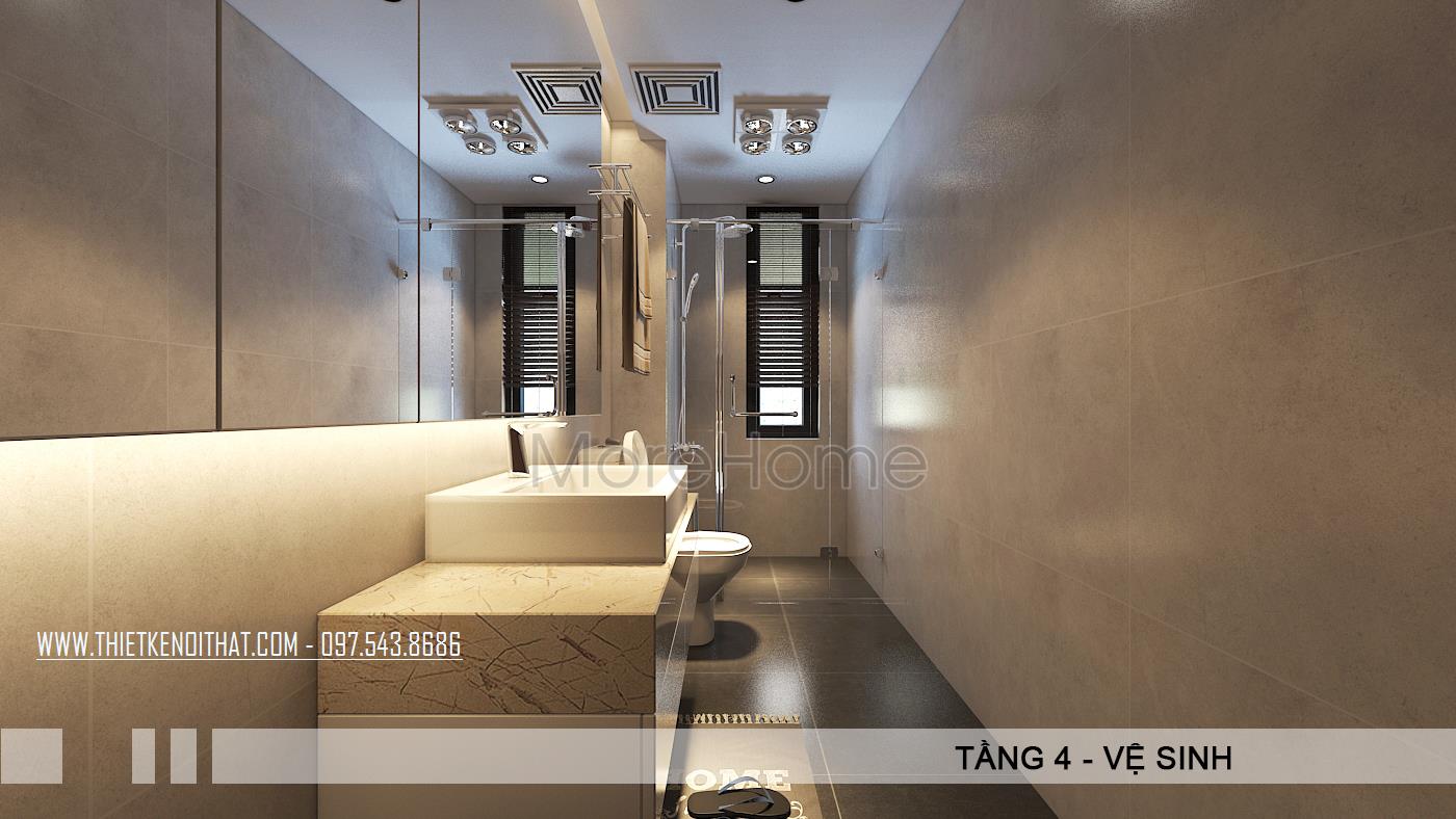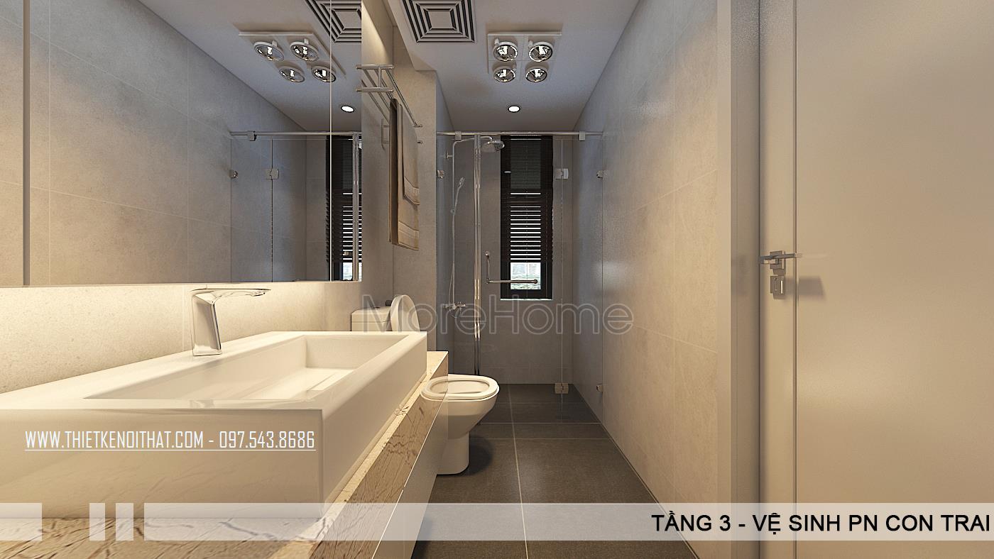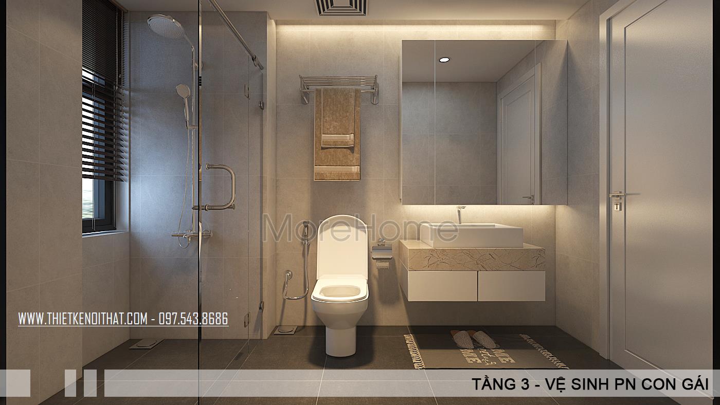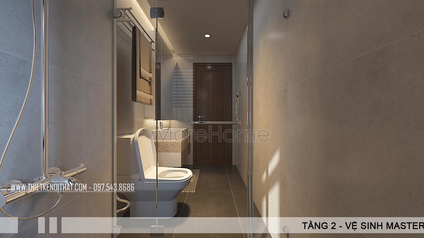 Thiết kế phòng tắm đơn giản, tinh tế và tiện nghi với vách kính phòng tắm và thiết bị vệ sinh hiện đại. Mang đến người dùng cảm giác thư thái nhất.
