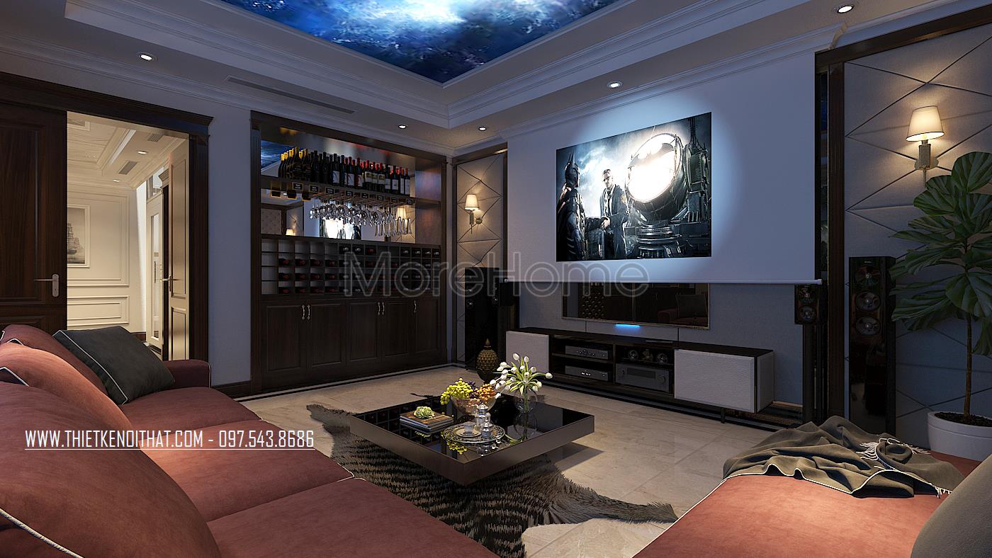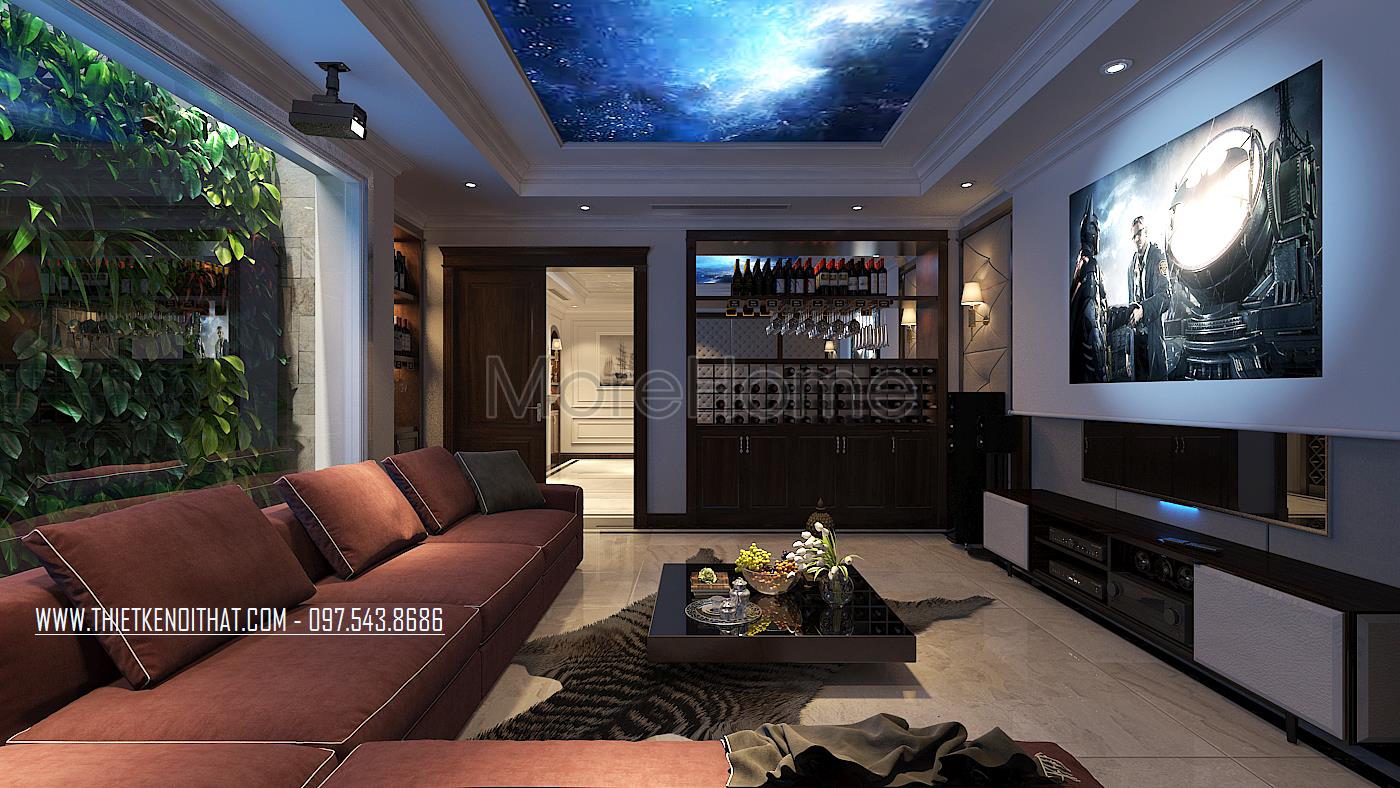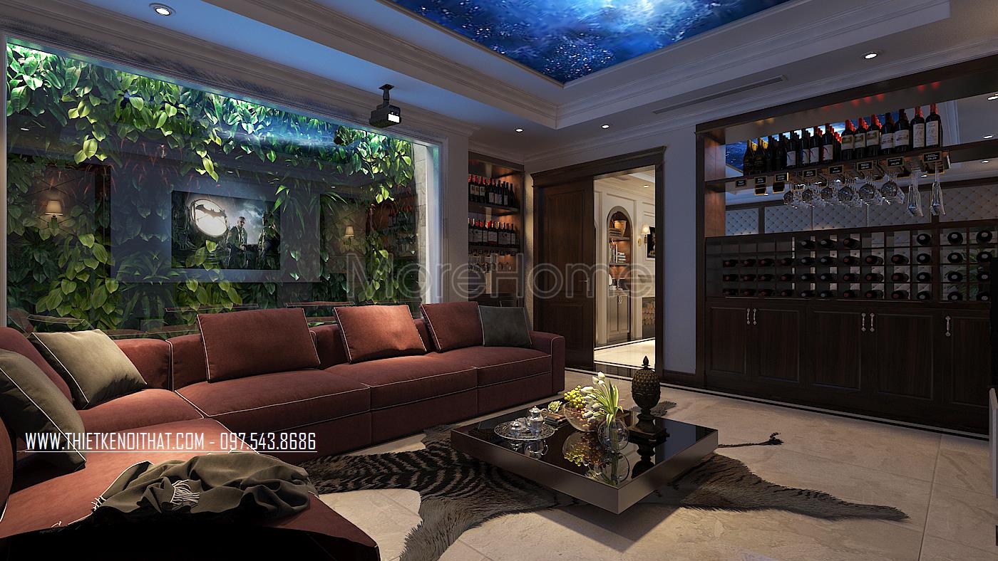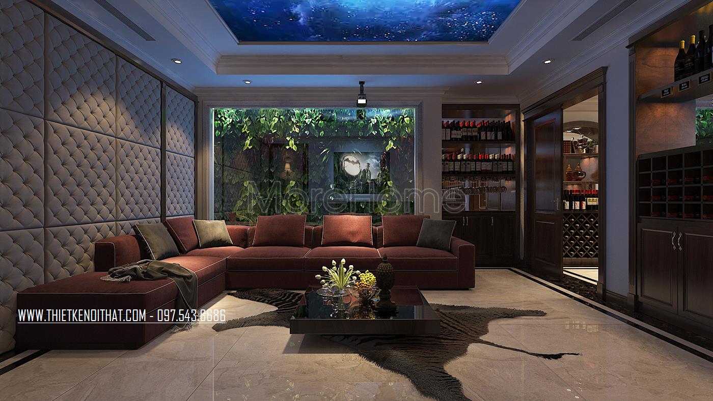 Tầng hầm của căn biệt thự được thiết kế với không gian phòng rượu kết hợp phòng karaoke cao cấp. Ở đây, KTS đã thiết kế với bộ sofa chữ L bằng nỉ màu đỏ mận cao cấp kết hợp với hệ tủ rượu đa năng giúp gia chủ trưng bày rượu một cách sang trọng và tinh tế nhất. Một chiếc tivi lớn cùng với hệ loa đài âm thanh tạo nên không gian giải trí thật tiện nghi. Mảng tường cao cấp được ốp bằng nệm sofa giúp cho việc cách âm tối đa nhất.