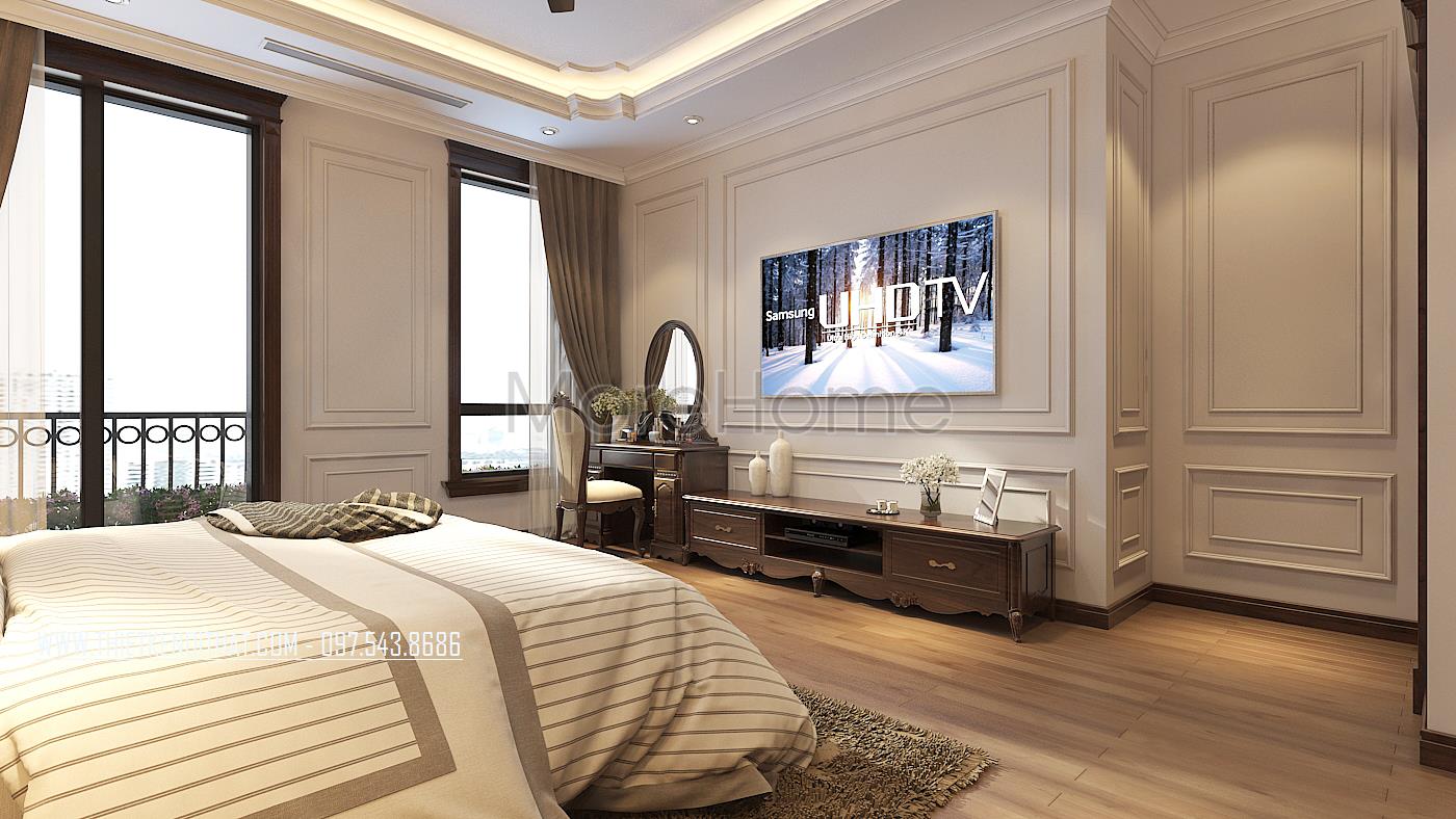 Phòng ngủ thứ 2 được thiết kế sang trọng hơn với với đầu giường khung gỗ bọc nỉ cao cấp. Bàn trang điểm được thiết kế cổ điển giúp cho gia chủ có được không gian làm đẹp tuyệt vời nhất.