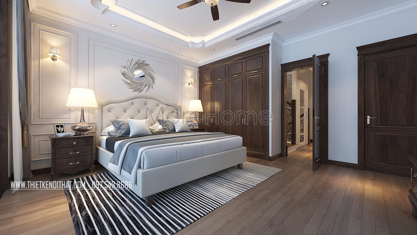 Tầng 2 căn biệt thự là không gian nghỉ ngơi của gia chủ. Phòng ngủ được thiết kế khá hiện đại và tiện nghi với đồ nội thất bằng gỗ. chiếc giường gỗ đơn giản với gỗ tự nhiên tạo sự chắc chắn an toàn khi ngủ. Hệ tủ sách và bàn làm việc được thiết kế kéo dài tạo sự tiện nghi cho gia chủ. Tủ áo được thiết kế với hệ của mở thật chắc chắn và đa năng.