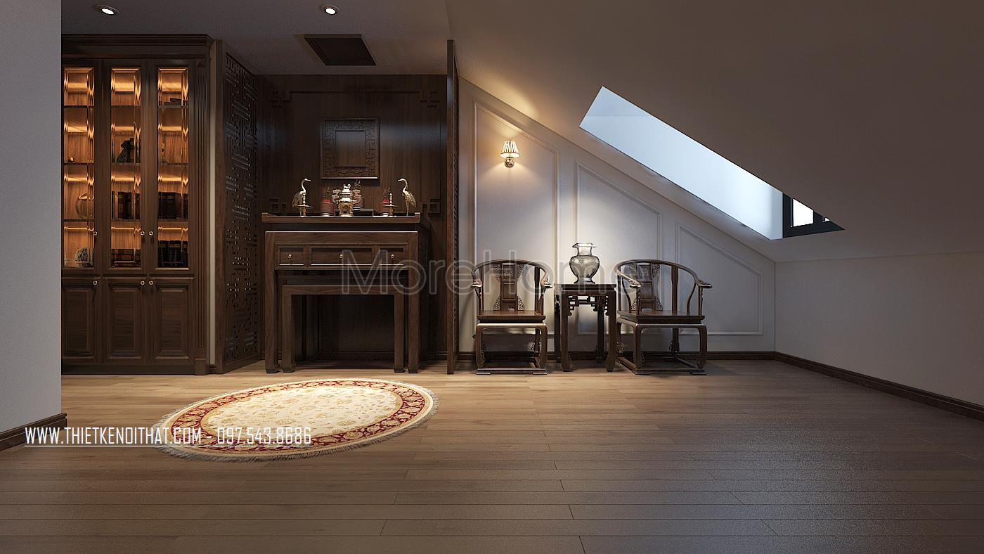 Phòng thờ được thiết kế trên tầng áp mái với mẫu bàn thờ hiện đại, kết hợp vách ngăn gỗ cao cấp. Không gian thờ cúng thông thoáng với thiết kế giếng trời thu hút ánh sáng cho phòng thờ.