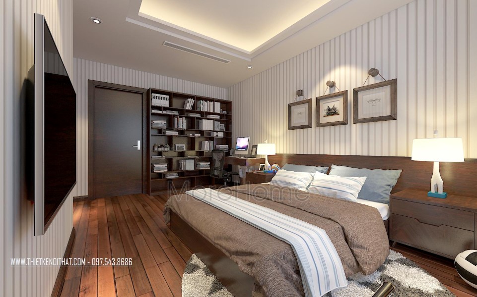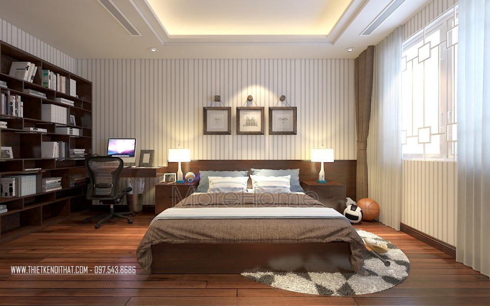 Một trong 2 phòng ngủ thiết kế theo phong cách hiện đại với khá đơn giản, mang vẻ đẹp năng động và ấm áp. Tone màu nâu trầm khéo léo tạo hiệu ứng cảm xúc tích cực, gợi sự yên bình và an toàn. Thiết kế tường thô đơn sắc được kiến trúc sư thay bằng thiết kế sử dụng giấy dán tường hoa văn đơn giản, tăng tính linh hoạt cho căn phòng, thay đổi cũng khá dễ dàng. Tủ và kệ gỗ được kết hợp khéo léo vừa đảm bảo tính công năng lại không làm mất đi nét đẹp thẩm mỹ.