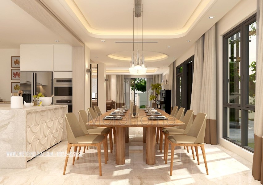 Thiết kế không gian bàn ăn rộng rãi, phù hợp với nhiều mục đích sử dụng, kể cả các bữa ăn gia đình ấm cúng hay các bữa tiệc nhỏ của gia đình. Thiết kế đèn chiếu sáng, tủ kệ hay các chi tiết nhỏ từ cửa sổ, rèm cửa đều khá ấn tượng từ kiểu dáng đến màu sắc, đảm bảo cân bằng hình khối và mang đến sự hài hòa cho không gian sống.
