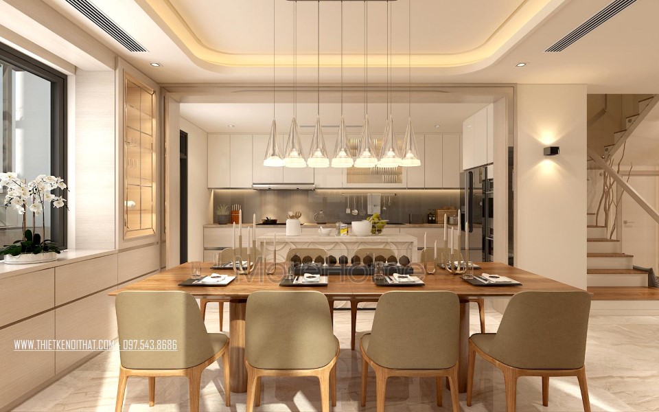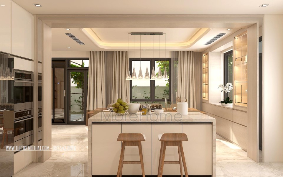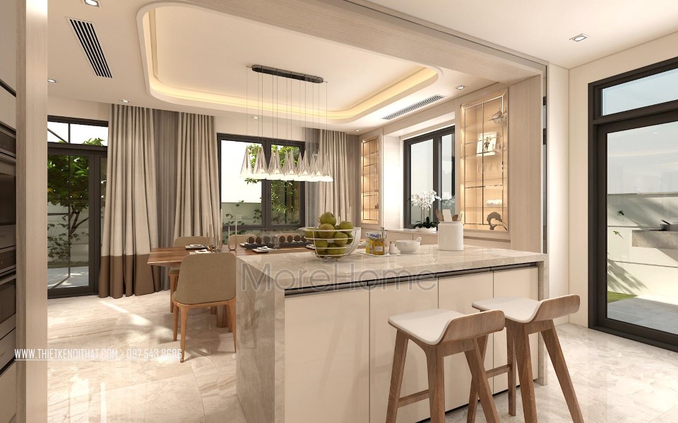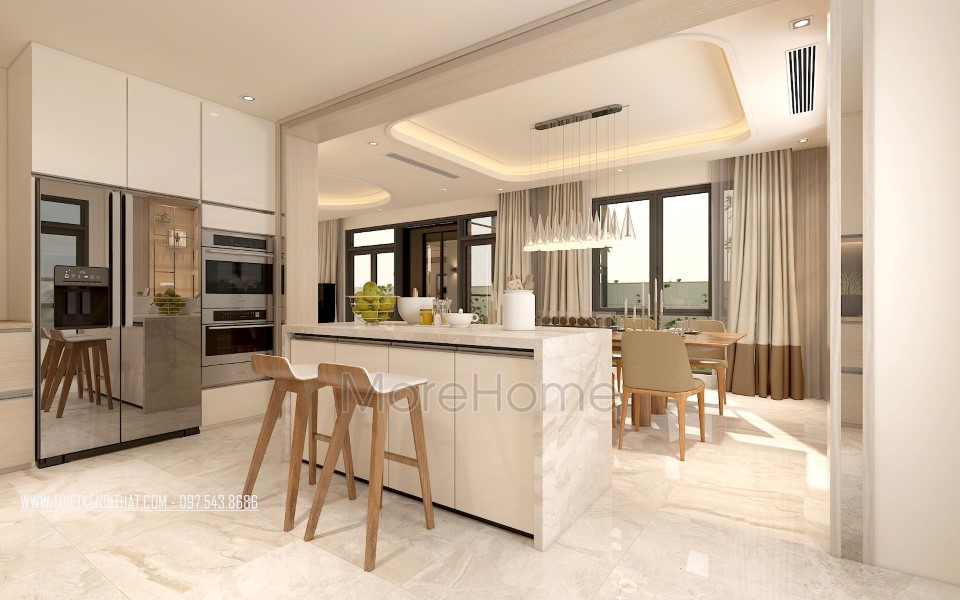 Căn biệt thự được thiết kế rộng rãi, phân chia bếp và phòng ăn riêng biệt, sắp xếp liền kề, mang phong cách hiện đại và thu hút. Tone màu trắng từ sơn tường đơn sắc và đá tự nhiên khá đồng bộ với thiết kế màu nền giúp không gian trở nên đồng nhất, góp phần lớn định hình phong cách hiện đại và sự thống nhất trong không gian.