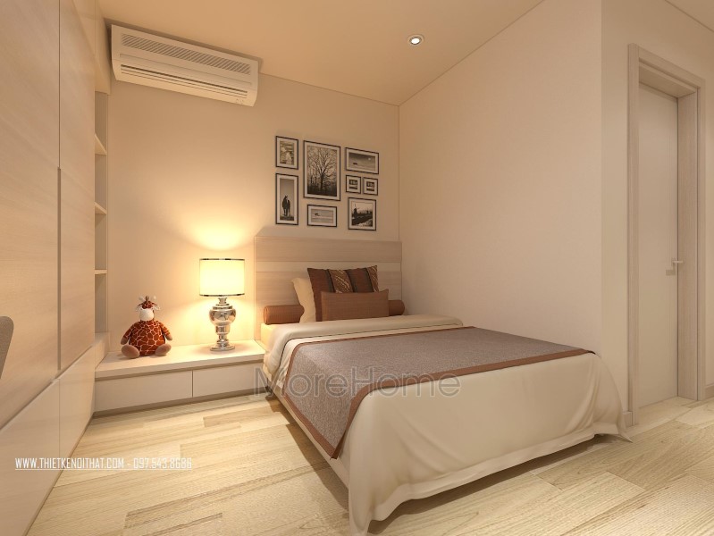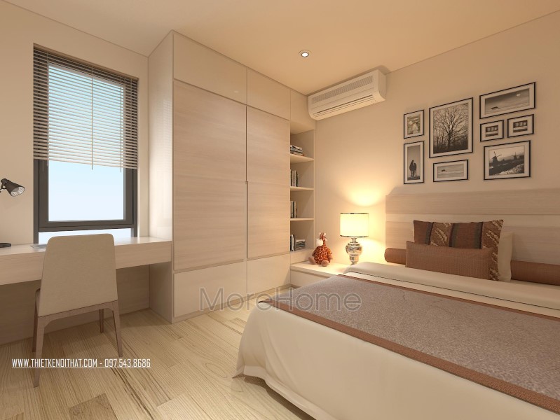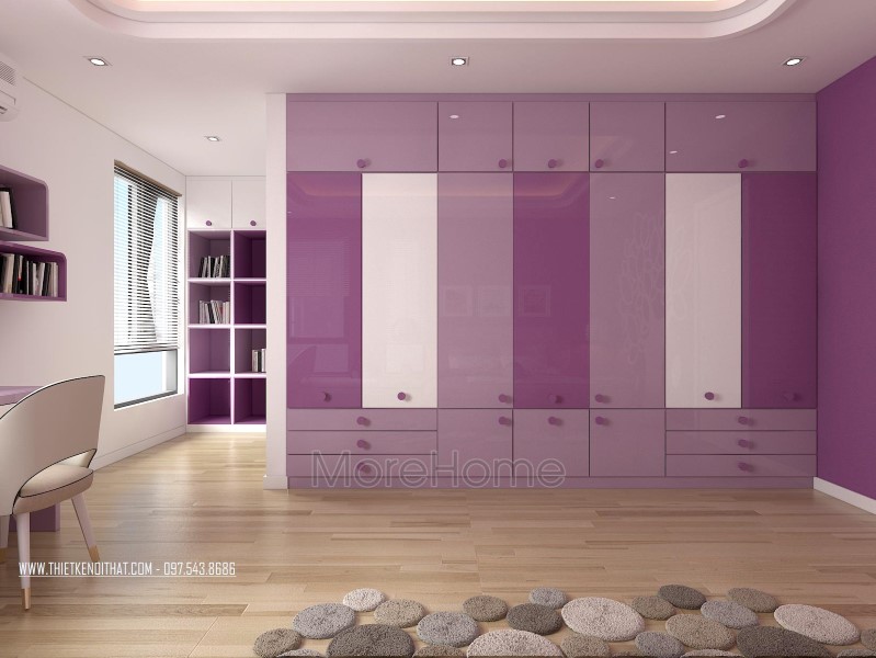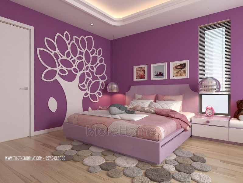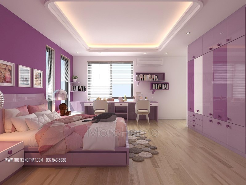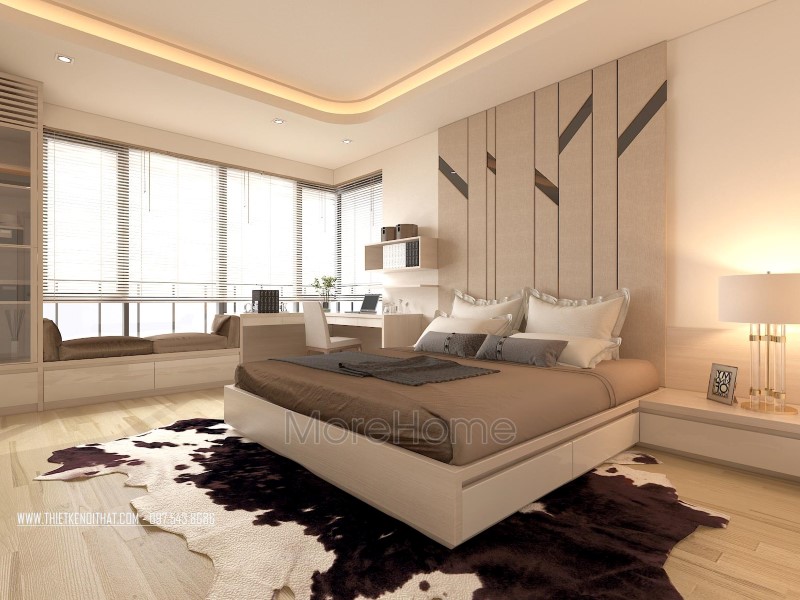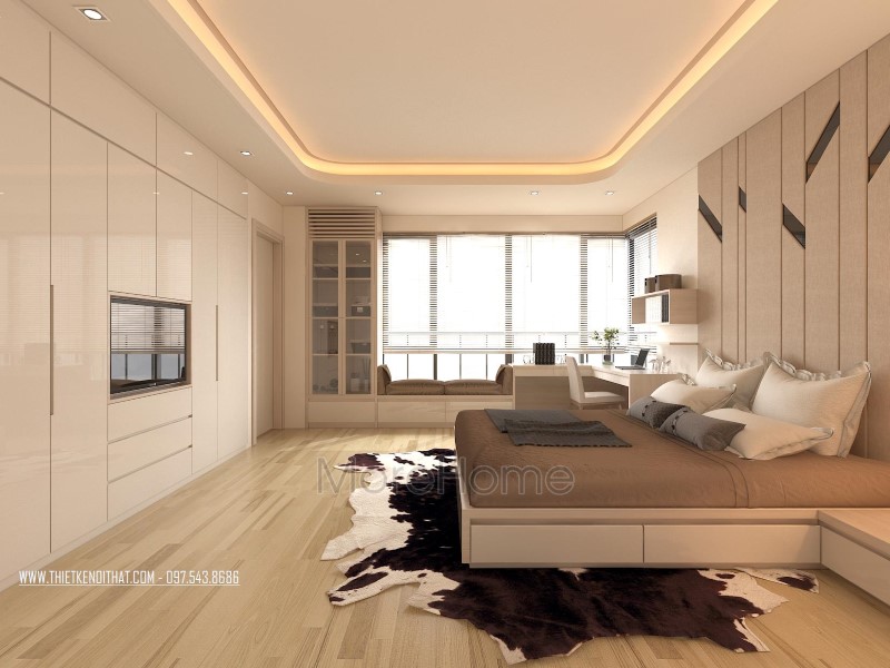 Thiết kế nội thất không gian phòng ngủ khéo léo sử dụng các tone màu đa dạng hơn để mang đến sự thay đổi mới lạ và cảm giác gần gũi cho không gian riêng tư. Tone tím hay nâu trầm, sữa được sử dụng khá nhiều giúp thiết kế trở nên sống động và thu hút hơn hẳn. Không gian phòng ngủ với các khung cửa nhỏ đem ánh sáng tự nhiên vào căn phòng. Các kệ tủ, hay ngăn kéo được tận dùng ở các ngách nhỏ của phòng giúp không gian trở nên vô cùng tiện nghi, sáng tạo, và góp phần tiết kiệm diện tích sử dụng.