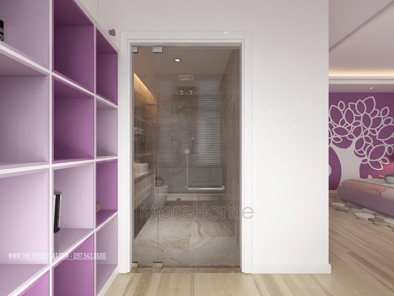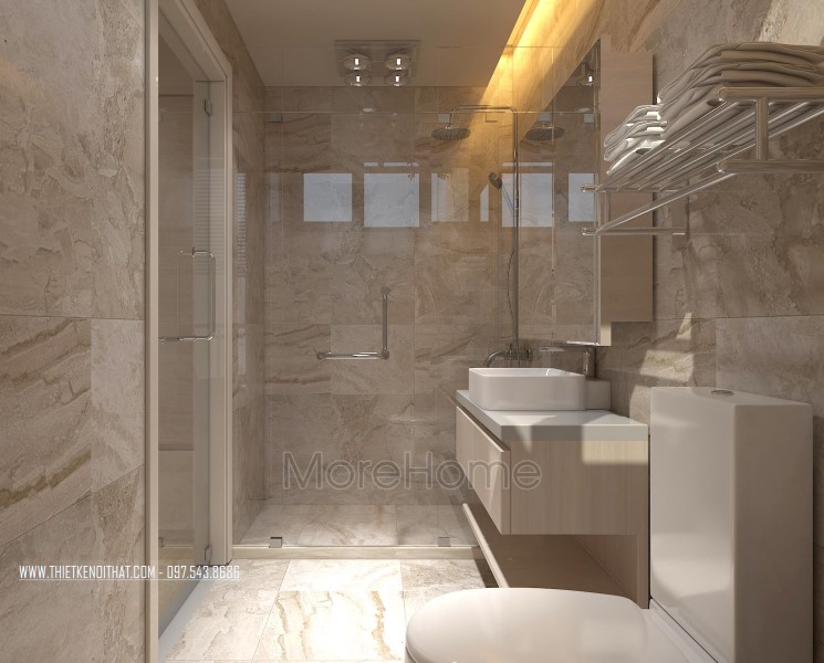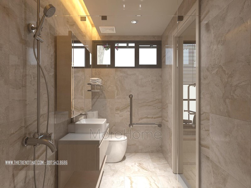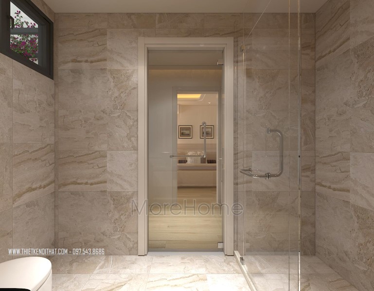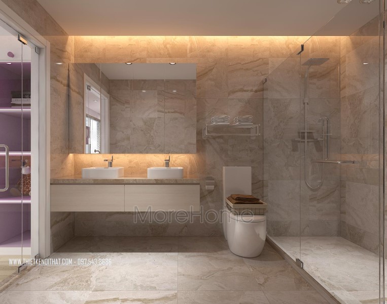 Cuối cùng là thiết kế không gian phòng tắm hiện đại. Phòng tắm nổi bật với các thiết kế hiện đại và sang trọng. Các vật liệu xây dựng nhẹ lựa chọn khá kỹ lưỡng như kính cường lực, gương phản chiếu, đá tự nhiên,… giúp tạo độ tương phản nhẹ cho không gian, góp phần tăng độ mở cho phòng vệ sinh.