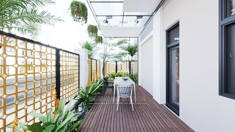 Chọn thiết kế kiến trúc xanh để tạo nên một không gian thư giãn với mái hiên là một dàn treo xanh ngắt, có thể ngồi dưới để uống trà và trò chuyện.