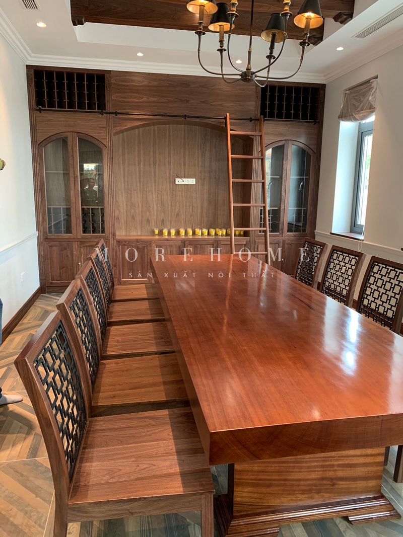 Thi công bộ bàn ăn 10 ghế gỗ óc chó có tựa thoải mái vững chắc, diện tích rộng rãi thoải mái cho quá trình sử dụng